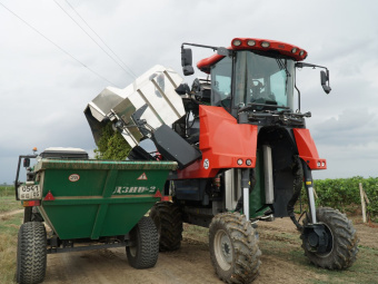 A special harvester has been purchased by Derbent sparkling wine plant. As to the deputy director of the enterprise on agrarian issues Gaidar Shuaibov, it is possible to harvest from 5 to 7 hectares of vineyards per day, this is the daily norm of a hundred or more workers. Due to harvesting by the new machinery the losses are minimal.