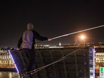 The performance started at 23 o'clock on May 26, on the eve of the 315th birthday of the city, as part of the light-music show "Singing Bridges". The wirewalker said that he started to train several months ago to perform with minimal use of safety ropes.