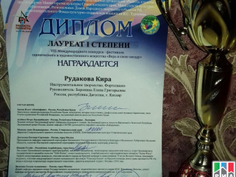 The students of the piano department of Kizlyar children's art school No. 2 Kira Rudakova and Irina Bondareva took part in the competition. They performed the works of Dagestani composer Gottfried Gasanov and I st degree became laureates of the creative contest.