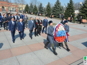Then, the guests proceeded to the Memorial of Glory to lay flowers and wreaths, see the architectural and cultural complex, and plant spruces with their name plates. The Memorial of Glory was set up in 2005 to honour the 60th anniversary of the victory over the Nazi Germany in the Great Patriotic War. The architectural complex combines a sculpture of St. George, the Eternal Flame, a triumphal arch and a mosaic stele depicting the main episodes of the battle against fascism.
