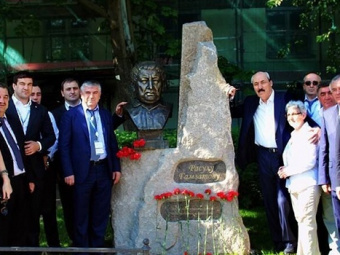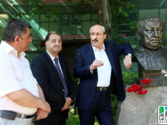 Makhachkala, May 26, 2014. On his working visit to St. Petersburg, Daghestani Head Ramazan Abdulatipov laid flowers to the bust of Rasul Gamzatov erected at the Modern Art Museum of the St. Petersburg State University.