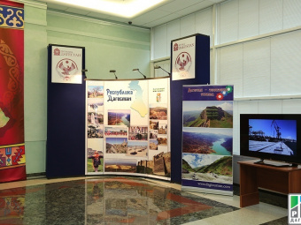 The exhibition titled "Multinational Daghestan" consists of presentations of priority development projects and the investment potential of the republic, handicrafts, paintings of Daghestani artists, books of Rasul Gamzatov, the national poet of Daghestan and Daghestani Head Ramazan Abdulatipov.