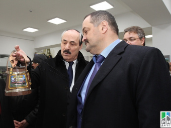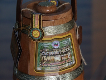 Makhachkala, September 11, 2015. The new brand "Derbent - 2000" of honey in wooden barrels with Dagestani traditional ornament presented in Dagestan.